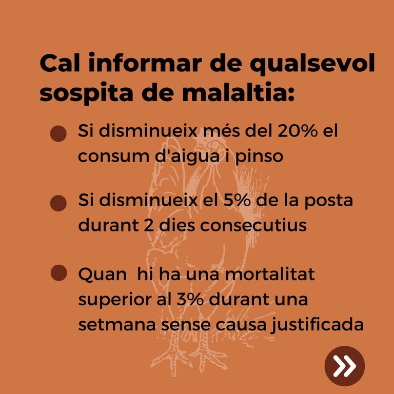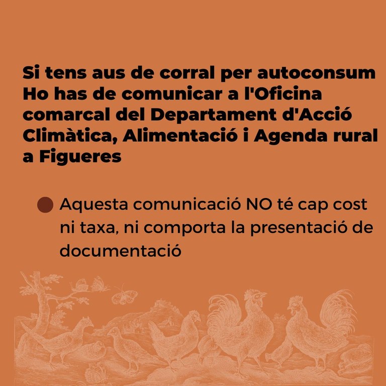 - Aquells ciutadans amb tinença d’aus de corral no registrades procedeixin a registrar-les i implementin mesures de bioseguretat per minimitzar el risc de contacte d’aus salvatges amb les aus de corral.